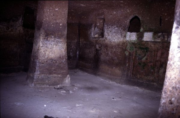 Manche Räume der Domus de Janas sind so groß, dass sie durch eine Säule oder einen Pfeiler gestützt werden. Es handelt sich bei diesem Raum um das Zentrum, von dem die Grabkammern abgehen.